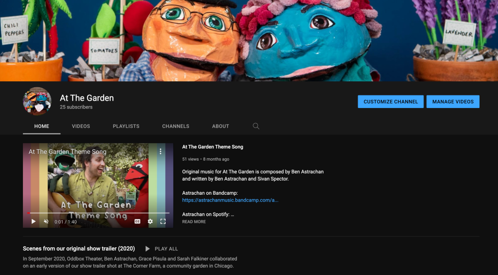 Logline: “A diverse crew of puppets and adults grow together as they read books, solve problems, sing songs and explore nature and sustainability while At The Garden.”