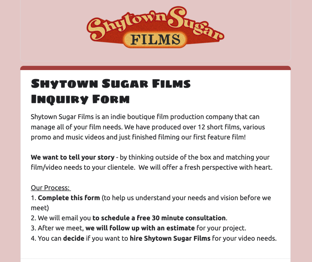 - After we meet, we will provide you with a budget for your project. You can decide if you want to hire Shytown Sugar Films for your video needs.